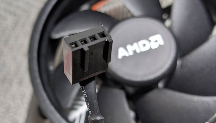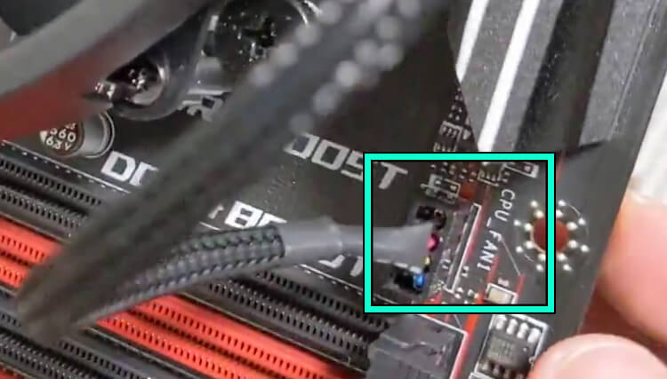 そして、CPUクーラーから出ているケーブルをCPU FANと書かれたコネクタに挿します。