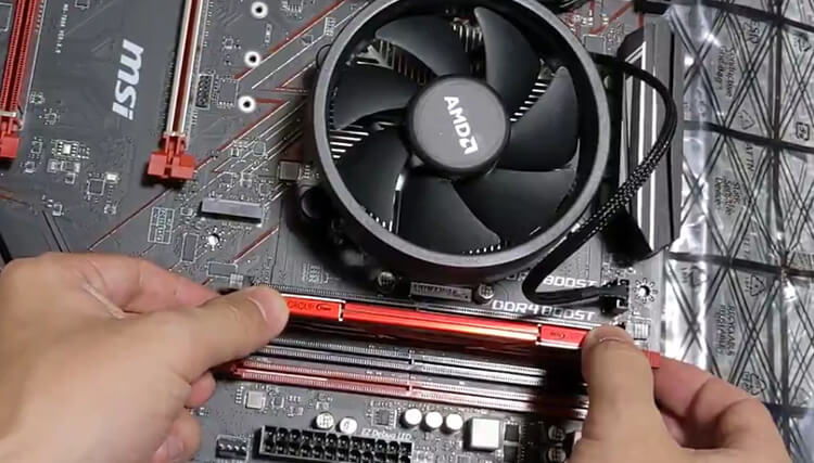 メモリのスロットとメモリの切り欠きを合わせて左右のロックレバーを下ろします。
