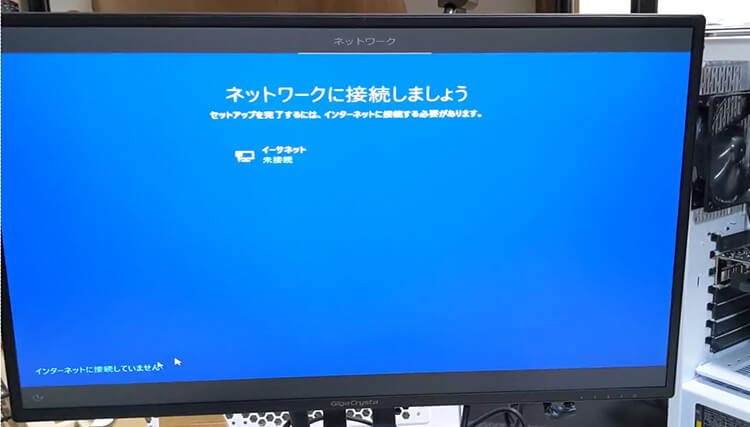 画面の指示に従っていくとネットに接続してくださいを表示されるのでLANケーブルを繋いでネットに接続します。