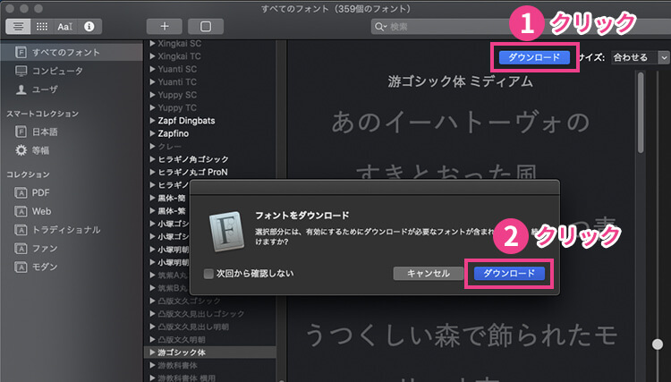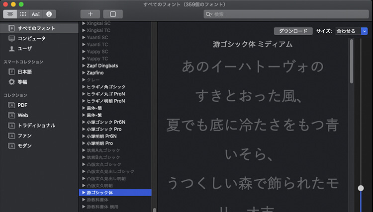 游ゴシックを再度使用可能にするにはFont Bookから游ゴシックを再ダウンロードするとOKです!