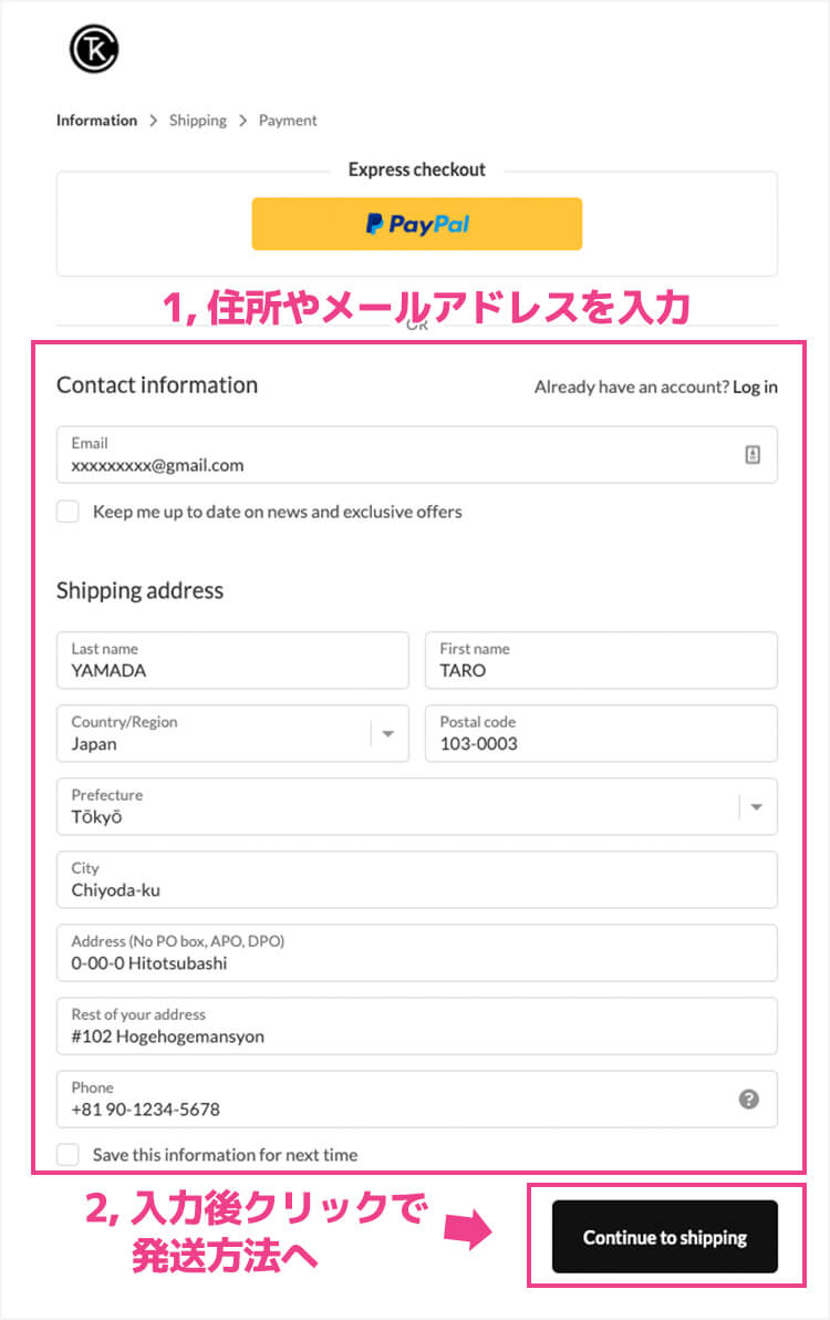 入力が終わったら「Continue to shipping」をクリックを発送方法へ進みます。