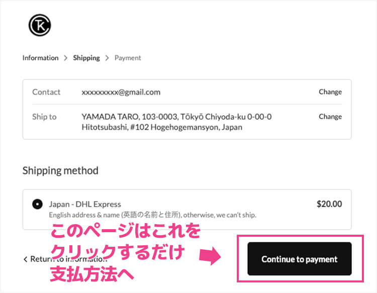 この画面では発送方法を選択しますが「Japan - DHL Express」しかないのでさっさと「Continue to payment」をクリックして支払方法へ進みます。