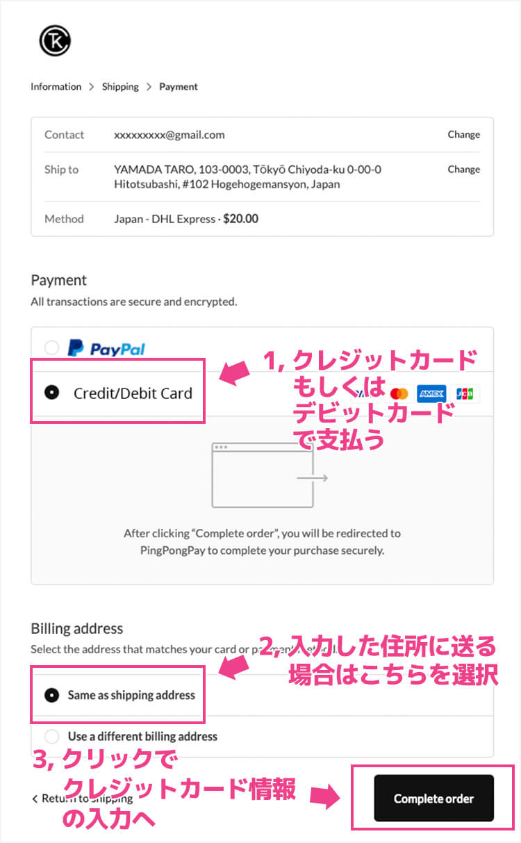 完了したら「Complete order」をクリックしてクレジットカード情報の入力に進みます。