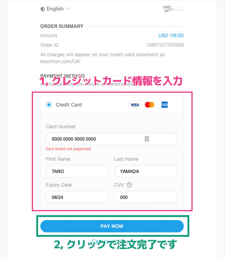入力が終わり「PAY NOW」をクリックすると注文完了です。