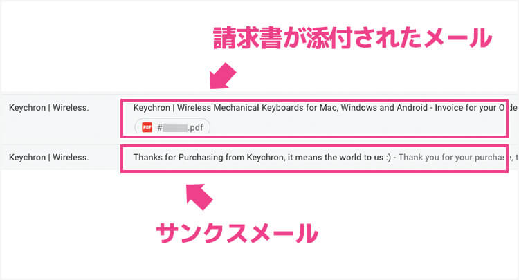 - 注文番号と請求書(PDF)が添付されたメール