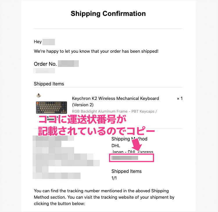 無事発送完了メールが届いたらDHLの運送状番号が記載されてれいます。