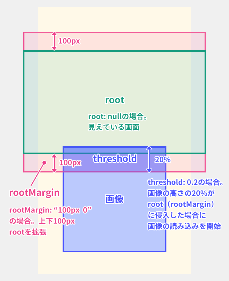 つまり上下100pxを拡張しているので遅延読み込みのタイミングが100px早くなります。